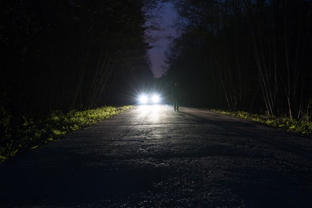夜の森を通って暗い山道の端に男性のシルエット 暗い青空の風光明媚な夜の風景 車のヘッドライトの明かりに逆らって道路に立っている男 道端の車 の写真素材 画像素材 Image